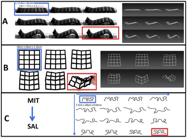 為了展示其研究成果,研究人員利用兩種不同的材料來制造出可展示各種屬性的3D打印結構。據了解,其中包括一種吸水材料——這是Stratasys公司開發的一種特殊材料,到現在為止仍然保密——這種材料如果浸入水中,能夠膨脹至原有體積的兩倍,而在其它時候會仍然處于剛性狀態,因為它是用一種硬塑料制成的。到目前為止,他們已經用這種吸水性材料創建了一個15×15英寸的方格,這種方格可變化復雜的幾何形狀。