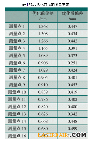 測量結果的影響因素主要包括:儀器精度、振動、零件擺放位置等幾個方面。儀器精度是固定因素,由于復材零件的精度要求為±1mm,遠大于激光跟蹤儀的精度,因此儀器精度的影響幾乎可以忽略不計。振動可以通過選擇激光跟蹤儀的站位控制。零件擺放位置成為影響測量結果的主要因素。由于在測量過程中,復材零件的位置是由成型模具來確定的,而在安裝過程中,零件不可能與模具完全貼合,所以零件擺放位置必然產生很大的誤差,解決的方法是以零件自身為基準,對測量結果進行數值擬合法的優化處理,這樣可以減少由于擺放位置對測量結果造成的影響。表1為擬合優化前后的測量結果。從表1中可以看出,優化前的測量結果與理論值偏差較大,但這些數值并不能表現出零件真實的情況,通過擬合優化后,測量結果的偏差大幅減低,消除了由于擺放位置產生的誤差。而優化后的結果才能反映出零件真實的情況。