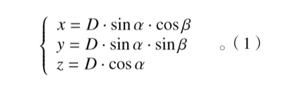 當反射器離開基準位置(基準位置距儀器中心的距離已知),并在空間移動時,激光跟蹤儀會自動跟蹤反射器,同時記錄干涉測距值D 及垂直度盤和水平度盤上的角度值α、β ,用這3個觀測值,依據公式(1)