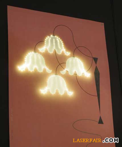 特殊紙張上繪制有圖案等繪畫,在LED關燈時亦可充當海報。在該公司的展位上,展示了由模仿枝形吊燈、傳統照明等圖案與LED光線組合而成的試制品照明。