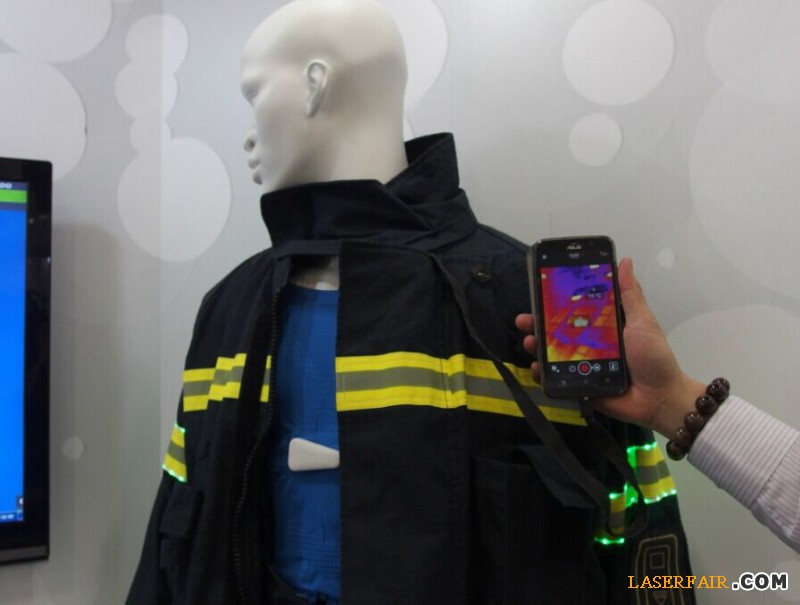 消防衣黃色警示條配有 LED 燈,衣服本身配有 USB 數據線,接上智能手機即能擁有熱顯像儀功能