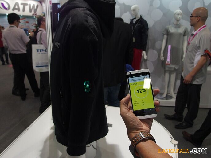 而在智能衣最為常見的運動機能應用結合,也有些不同的突破,結合LED的外套,LED燈光還會隨著運動強度的不同做改變,紡織所產品部系統開發組組長沈干龍還透露,今年第四季將發表人體運動力學量測、以電刺激緩和運動疲勞的智慧衣技術。