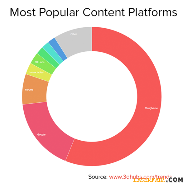 根據報告內容,6月份的最受歡迎3D內容平臺是免費在線3D模型庫Thingiverse,該網站獲得了56%的支持率,占據絕對多數。令人驚訝的是谷歌排名第二,不過這也解釋得通,因為很多人依賴搜索引擎來尋找和下載3D模型。接下來是Reddit,而開源硬件網站Instructables名列第四。