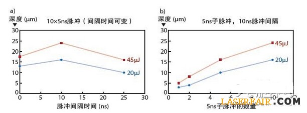 圖(b)是改變子脈沖的數(shù)量帶來的不同材料去除率。每一串子脈沖的總能量固定為20或45μJ。