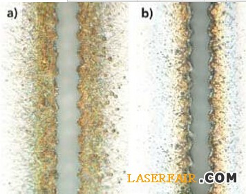 圖(b)是使用了雙脈沖模式(170μJ/脈沖)的上表面視圖。這兩種情況中的劃刻深度都是4μm。