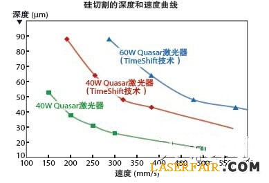 我們使用Quasar激光器對厚度小于100μm的拋光單晶硅片進(jìn)行熱損傷最小的高速刻劃。在圖1中,曲線顯示,隨著劃刻速度的增加,劃刻深度會降低(200kHz、25ns單脈沖)。在較高的重復(fù)頻率下使用較高的功率,同時TimeShift技術(shù)可以用軟件設(shè)置范圍廣泛的脈沖能量和脈沖寬度,最終我們可以看到,刻劃速度提高了差不多3倍(25ns單脈沖,50μm的刻劃深度)。