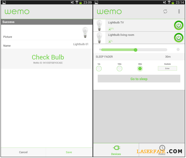 第四步驟,WeMo版面列出的不同燈泡能提供開關(guān)、1-100%光暗度、睡眠時間調(diào)校(Sleep Fader)。另外,于版面的右下角可設(shè)定不同規(guī)則,例如可將燈泡根據(jù)每天日出日落自動開關(guān),而且能以漸亮漸暗的方式讓用家更易接受,于日落時開啟,日出時自動關(guān)閉,省電節(jié)能。