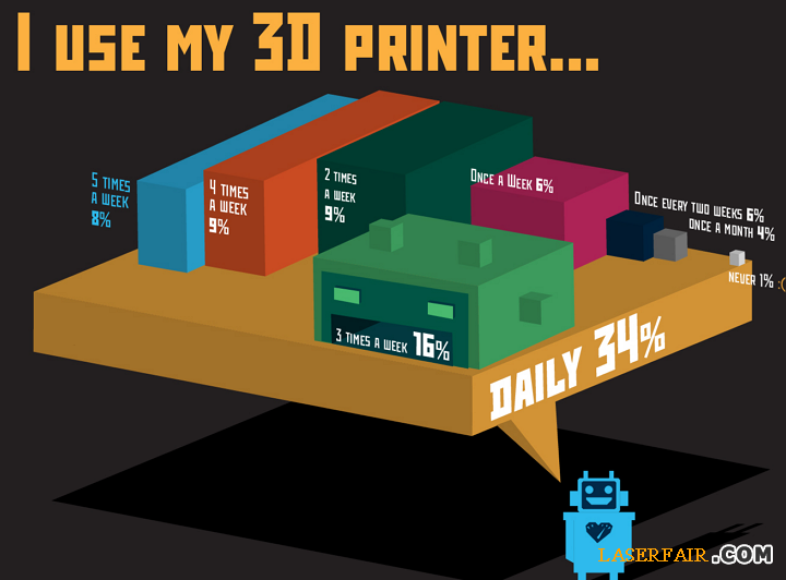 這501名受訪者還表示,平均而言,他們每個月3D打印21個對象,而且受調查者的34%每天都進行3D打印;而11%的人說他們只是偶然用一下3D打印機;超過50%的人表示他們每周至少用4次3D打印機。