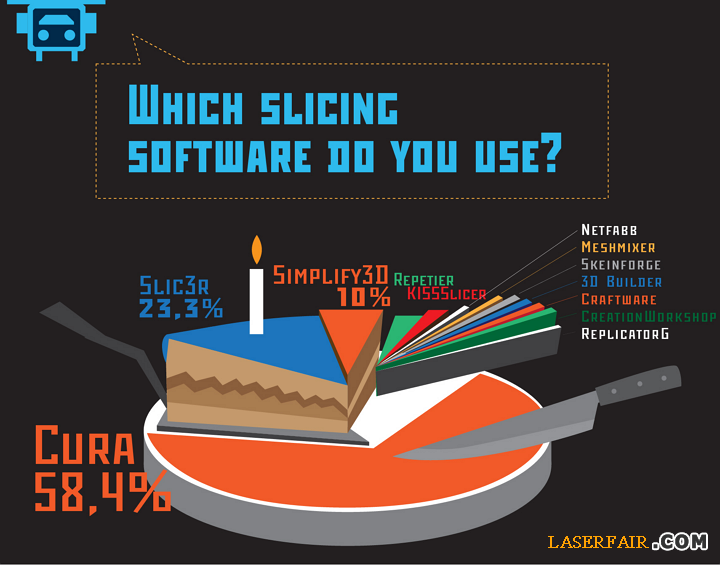 在切片軟件方面,58%的受訪說他們使用Cura,23%的人使用Slic3r,使用Simplify3D的有10%。(注:Cura是Ultimaker開發的,因此YouMagine可能更為偏愛Cura)