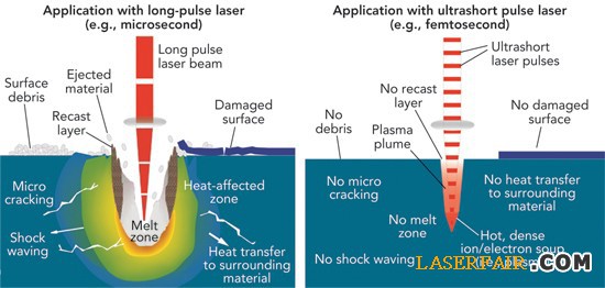 圖1此圖對比了采用毫秒級激光器與飛秒級激光器的加工結(jié)果