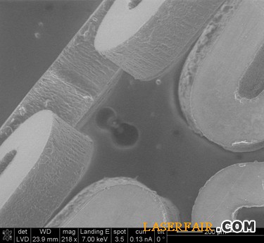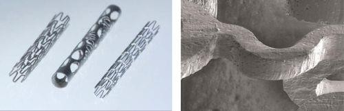 可生物吸收型材料已經(jīng)在歐盟用于冠狀動脈支架,盡管目前還未收到美國食品藥物管理局(FDA)對其在美國使用的批準。這種材料絕大多數(shù)由聚酯構(gòu)成,主要為聚乳酸和聚乙醇酸的均聚物和共聚物。此材料在各種應用領域表現(xiàn)出光明的前景,包括已經(jīng)多次置入支架并因而無法耐受傳統(tǒng)固定支架治療的患者用心血管支架。這種材料目前還用于在插入器官后向身體器官輸送藥物,能以恒定的速率將藥物釋入,且材料最終在預先制定的時間內(nèi)溶解。圖4所示為一個飛秒級激光器切割可生物降解型支架的示例。