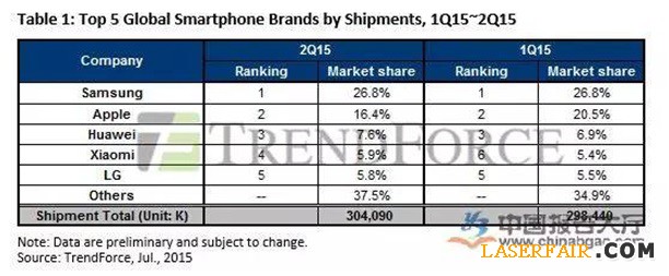 調研機構TrendForce送出了2015年第二季度全球智能手機報告公布的數據顯示,2015年第二季全球智能手機出貨量為3.04億部,較上個季度增長1.9%。而排名前五位的智能手機制...