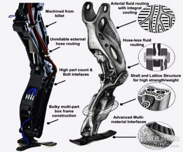從上面的圖中您可以看到Atlas正在測試中的3D打印腿,與當下的機械腿的比較。使用3D打印技術使得研發團隊能夠將液壓系統像血管一樣分布在整個肢體,增進其效率并提高其冷卻能力,而先進的多材料表面將增加Atlas的整體功能和耐久性。