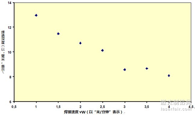 第一項試驗是典型結構鋼的堆焊試驗,該試驗主要是為隨后的試驗積累基礎參數。試驗設計為125毫米準直鏡,250毫米聚焦鏡,光波導, 200μm芯徑, 90/10比例的氬-CO2的保護氣體對焊接過程進行保護,焦點位置設置為-2毫米,焊槍傾角25度。1.2毫米G3Si1焊絲,送絲速度為12米/分鐘。弧焊與激光縫焊之間的間隙為2.5毫米。數據顯示,焊接速度為1米/ 分鐘時,焊透深度為13毫米;當焊接速度提高至4米/分鐘時,焊透深度仍可達到8.1毫米(如圖6所示)。