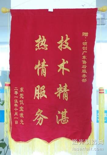 激光制造網消息:2015年10月15日,位于昆山的領創激光公司客戶服務部收到東莞客戶送來的“技術精湛,熱情服務”的錦旗,以此感謝領創激光給予該企業的大力支持和幫助。