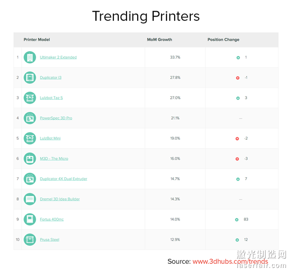 而在3D打印機的增長趨勢排行榜上就變化比較大了,由于這里只比較增長率,因此我們經常能夠看到很多新面孔出現。Ultimaker 2本月上升一位成了增長最快的3D打印機品牌。而最近剛獲《Make:》雜志評測大獎的LulzBot TAZ 5不出意料,從第5位一躍升至第2。而正式上市不久的Micro 3D打印機跌出了前五名,月度增速為16%,而3D Hubs指出由于該公司在Kickstarter售出的1萬多臺3D打印機剛剛交貨不久,因此不能指望它會增長得很快。