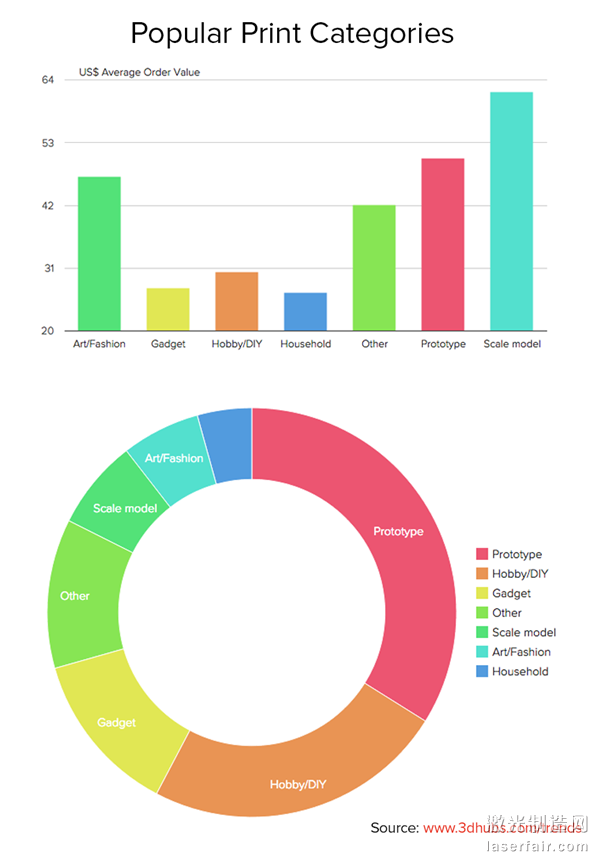 在平均訂單金額的分類別比較上,愛好/DIY、家庭用品和原型3D打印的訂單金額有所增加,而其他類別顯示略有減少。而在其市場份額方面,本月藝術與時尚方面的3D打印訂單數量增加,而對于愛好/DIY和比例模型打印方面的需求略有下降。至于顏色,黑色和白色依然是3D打印用戶的主要選擇。