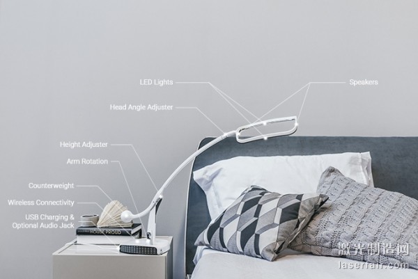 SleepCogni外形看起來非常像一個臺燈,它有一個配有USB接口的充電底座,一個非常細的可調節支撐架,支撐架的尾部內置了揚聲器和LED照明燈。整個支架能夠收集來自夾指板上的信號,夾指板中裝配了心率監測器、加速度計、壓力傳感器和溫度傳感器。