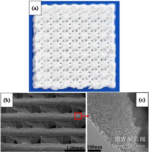 圖5. 3D打印具有編制大孔結構(a, b)以及有序介孔結構(c) 的多級孔結構的生物陶瓷支架,該支架具有優越的成骨活性。