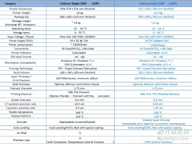 HyVision同時推出的另外一款3D打印機則是更加成熟的Cubicon Single3DP-110F),這是一款大尺寸的專業級3D打印機,可支持ABS/PLA材料,其打印尺寸也更大,最大可達24×19×20厘米。據稱其使用了韓國首個自行設計的可更換擠出機,并擁有類似于Style的打印床自動找平功能。