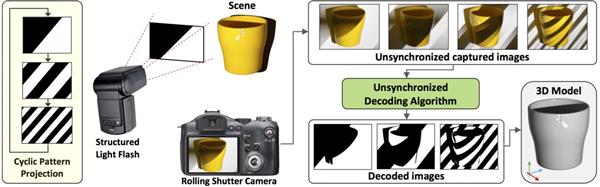 現有3D掃描技術的問題是,它往往依賴于一種被稱為結構光的昂貴圖像捕獲機制——該技術將連續的光圖案投射到目標對象上,被相機捕獲。然后根據這些圖案在掃描對象表面產生的變形,形成對象的3D模型。要做到這一切,硬件(特別是圖案投影儀和相機)需要完全同步,因此成本自然就上去了。