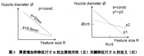 切割特征尺寸取決于分析厚度,主要取決于選取噴嘴的直徑。通過增加工藝氣壓進而增加碎片形成可以實現進一步的改進,但是會在工件底側形成無關的定向碎片。一般情況下是可以解決特征尺寸和噴嘴直徑的相關性問題的,如圖 5 所示。從激光切割設計的角度來看,碎屑形成的每塊板厚度都要確定一個關鍵的特征尺寸,以及為保證切割質量進一步減少特征尺寸而需要增加的氣體動態輸入。