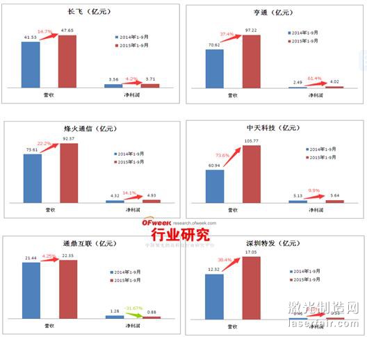 圖表6:2015年前三季度國內六大上市光纖光纜企業市場表現