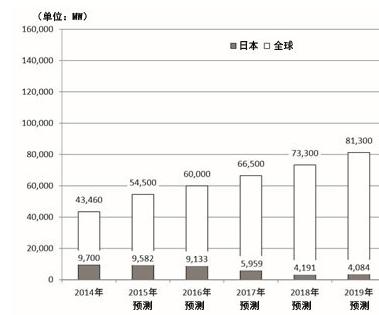 關于從接單到施工的前置時間較短的住宅市場,“因2014年秋季實施的并網擱置使得消費者的購買意愿降低,造成了供貨低迷”(光伏發電協會)。而非住宅市場方面,認證而尚未運轉的項目還剩余約58GW以上,因此最近幾年估計供貨會保持堅挺。多家民間調查公司預測,2016年的光伏發電市場將與2015年相同,繼續保持8~9GW的高水平。