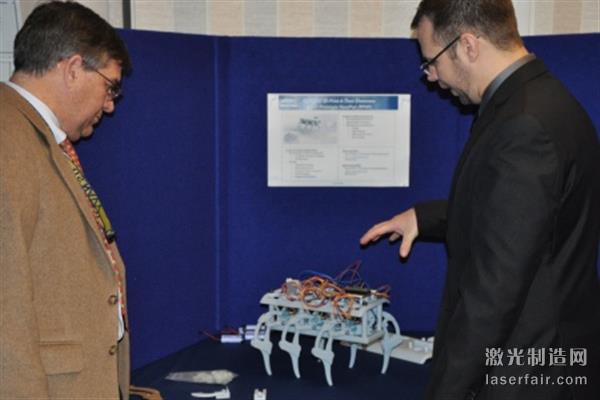 更令人印象深刻的是活動(dòng)中展出的六足機(jī)器人(HexPod Robot),該機(jī)器人仍處于開(kāi)發(fā)階段。它的目標(biāo)是輔助作戰(zhàn)人員,比如通過(guò)低功耗運(yùn)動(dòng)穿越困難地形等。這款機(jī)器人從最初的概念到變成一個(gè)完整的3D打印原型只用了四個(gè)星期(原本通常要用3到4個(gè)月)。有趣的是,在離活動(dòng)只有12個(gè)小時(shí)的時(shí)候,工程師們還通過(guò)快速調(diào)整減輕了它的重量,因?yàn)樗麄冇X(jué)得它太重了。