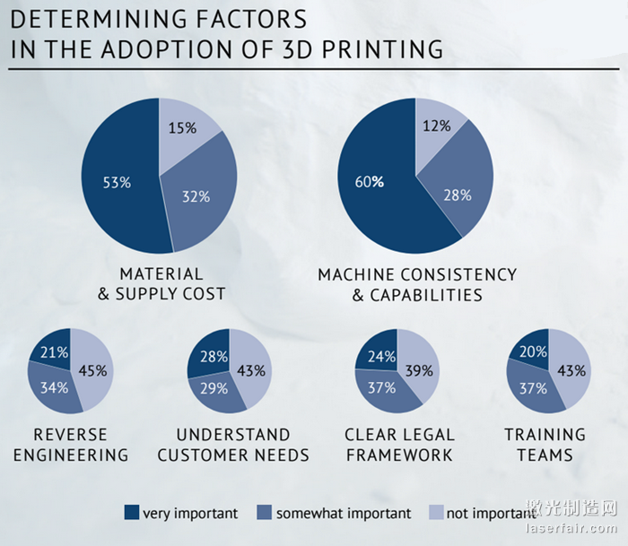 Sculpteo報告還預期更多的企業會更加看重“材料和供應成本”這一因素。該公司解釋說:“部分原因是我們將會看到一些新的垂直市場將出現在調查中。另外一個原因是3D打印機、3D打印服務和材料價格的下降。”更低的行業價格將導致更多的受訪者認為成本是決定該技術被采用的一個重要因素。