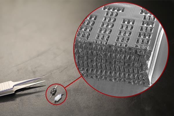 就像在玩一種人體版的疊疊高(Jenga)游戲,Zhang必需用手工堆疊起一系列超薄的3D打印可生物降解層,其中的每一層都是用一種被稱為POMaC的獨(dú)特聚合物3D打印出來(lái)的,這些薄片上面會(huì)加蓋由血管形成的管道結(jié)構(gòu),這些管道像人的頭發(fā)絲那樣細(xì)。構(gòu)建完成之后,Zhang會(huì)用UV光把這些小片“粘”到一起,就做成了AngioChip。