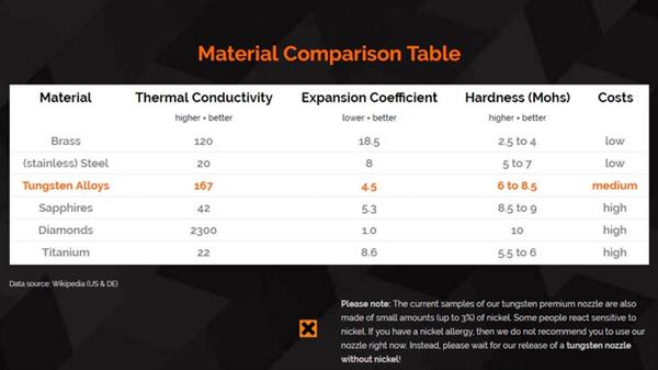 目前該鎢質噴嘴使用的是M6螺紋,可支持1.75毫米線材,如果他們的眾籌獲得成功的話,該公司還希望能夠再推出一個支持2.85/3毫米線材的鎢噴嘴。如前所述,由于其能夠承受很高的溫度,并就有很好的耐磨性,因此該噴嘴適用的材料范圍很廣,目前可支持的材料包括PEEK、尼龍、ABS、聚碳酸酯(M6)、甚至包括一些很磨噴嘴的材料,如碳纖維等。