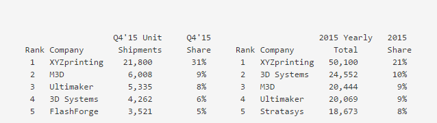 2015全球桌面級3D打印機前5位廠商(按銷量計)