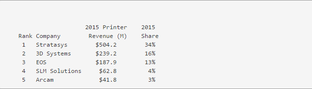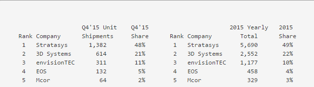 2015全球工業/專業級3D打印機前五位廠商(按銷量計)