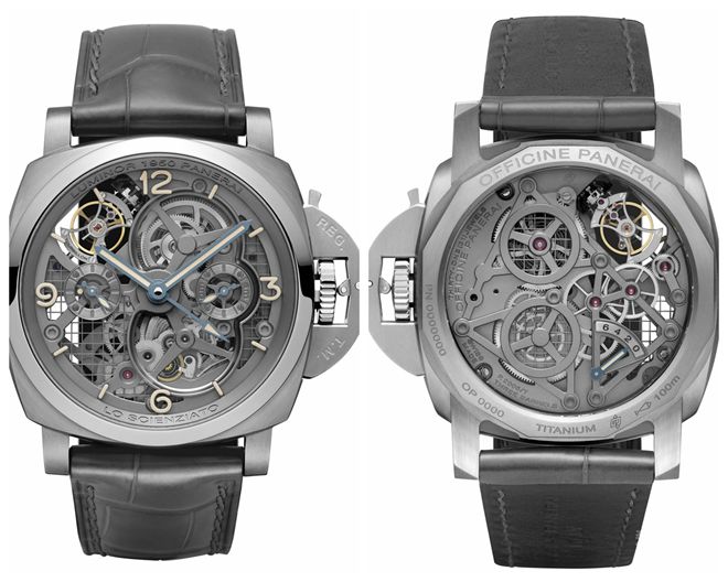 與我們常見(jiàn)的知名品牌一樣,沛納海也有自己強(qiáng)大的“科研中心”,并會(huì)時(shí)不時(shí)地推出一些尖端、甚至超前的產(chǎn)品。在沛納海,這類產(chǎn)品被統(tǒng)稱為L(zhǎng)o Scienziato,一個(gè)向天才伽利略致敬的系列。Luminor1950 Tourbillon GMT Titanio就屬于這個(gè)系列,而且僅生產(chǎn)150塊。