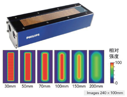 圖1展示了一個激光模塊從40×208mm表面發射輸出功率為9.6kW的光束。VCSEL模塊發出的光不需要進一步使用光學元件,它本身就非常均勻。右邊顯示的是光強分布和發射器與目標之間距離的關系。在距離達到100mm之前,光強分布保持得非常均勻。由于光束由數以百計的芯片組組成,所以可以單獨處理,從而有可能產生動態變化的光束分布。