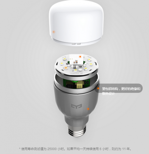 Yeelight智能燈彩光版選用德國歐司朗高品質(zhì)LED燈珠,白色燈珠顯色指數(shù)在80以上。其9W低功耗可實現(xiàn)600流明,相當(dāng)于60W白熾燈的等效照度。假設(shè)每天點亮3小時,燈泡可持續(xù)使用11年。防摔方面,1米落到木質(zhì)地板上不破碎。