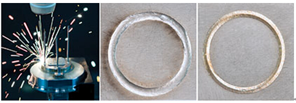 (拼圖7,8, 9) 左圖展示的是圓環焊接加工,由于看不出起始點和終點所以比傳統的焊接更加好。中間圖片展示了標準焊接在焊縫末端處有凹陷現象(一點鐘方向),凹陷點可能會形成失效的焊點。SmartRamp™工作時,會實時控制激光參數以避免產生這樣的缺陷焊點(右圖),最重要的是SmartRamp™可進行任何軌跡的焊接,包括圓形、矩形或線形。