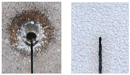 (拼圖 5、6) Laserdyne獨有的SmartPierce功能使得穿孔更加潔凈并且穿孔直徑和割縫一樣寬(右圖)。注意起始點直徑經控制后和切割寬度一樣,穿孔附近同樣沒有殘渣。相比之下,左圖標準穿孔會產生一個直徑大于切縫的孔,以及明顯的殘渣。兩圖中的穿孔都是在10.5mm(0.41inch)厚的617哈氏合金材料上進行的。