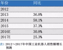 據(jù)睿工業(yè)2016年研究顯示,2015年中國工業(yè)機(jī)器人市場,其中以六軸多關(guān)節(jié)機(jī)器人為最,占總體銷量的46.2%。預(yù)計(jì)未來幾年將會維持30%以上的高增長率。我國機(jī)器人自動(dòng)化生產(chǎn)線裝備的市場剛剛起步,而國內(nèi)裝備制造業(yè)正處于由傳統(tǒng)裝備向先進(jìn)制造裝備轉(zhuǎn)型的時(shí)期,這就給機(jī)器人自動(dòng)化生產(chǎn)線研究開發(fā)者帶來巨大商機(jī)。人工替代和產(chǎn)業(yè)升級被認(rèn)為是推動(dòng)我國工業(yè)機(jī)器人市場快速發(fā)展的驅(qū)動(dòng)因素,與此同時(shí),我國目前的機(jī)器人密度(每萬名生產(chǎn)工人占有的機(jī)器人數(shù)量)相對較低也給未來市場的開拓提供了余地。