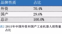 2015年,外資品牌工業(yè)機(jī)器人的市場表現(xiàn)遠(yuǎn)好于國產(chǎn)品牌,外資品牌銷售量占比70.4%,國產(chǎn)品牌銷售量占比29.6%。國產(chǎn)品牌工業(yè)機(jī)器人以Cartesian3D/2D、Articulatedarm和Delta3D/2D為主,價(jià)格較低,相較外資品牌而言,國產(chǎn)品牌機(jī)器人在銷售量、銷售額以及產(chǎn)品品質(zhì)等方面,都有很大提升空間。(見表2、圖2)