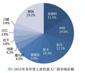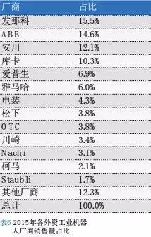 對比不同外資廠商2015年的銷售情況,外資廠商仍以四大家族為首,即發(fā)那科、ABB、安川和庫卡。四家廠商合計(jì)銷售占外資品牌總銷售量的比例超過50%,發(fā)那科銷售量最高,占比達(dá)到15.5%。(見表6、圖6)