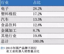 從行業(yè)來看,2015年中國市場國產(chǎn)品牌工業(yè)機(jī)器人的應(yīng)用行業(yè)比較分散,相較而言,電子行業(yè)和塑料橡膠行業(yè)是主要應(yīng)用行業(yè),與汽車行業(yè)和金屬加工行業(yè)相比,電子行業(yè)和塑料橡膠行業(yè)對機(jī)器人性能和穩(wěn)定性等方面的要求相對較低,兩個(gè)行業(yè)所應(yīng)用的機(jī)器人對Cartesian3D/2D、Delta3D/2D以及Articulatedarm需求較高,而本土廠商也有足夠能力生產(chǎn)這三種機(jī)型,因此,國產(chǎn)品牌工業(yè)機(jī)器人多數(shù)銷往電子行業(yè)和塑料橡膠行業(yè)。(見表9、圖9)