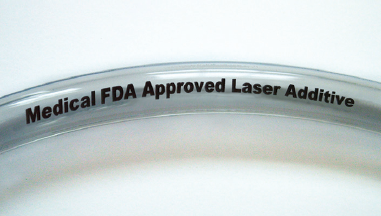 圖2:使用FDA批準的添加劑在醫用級管材上進行"在線飛行"激光打標后產生的烏黑標記對比度。