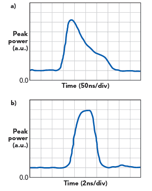 圖3:IPG推出的脈沖長度為100 ns(a)的固定脈沖光纖激光器以及另一款脈沖長度為4ns(b)的MOPA光纖激光器短暫的脈沖形狀。