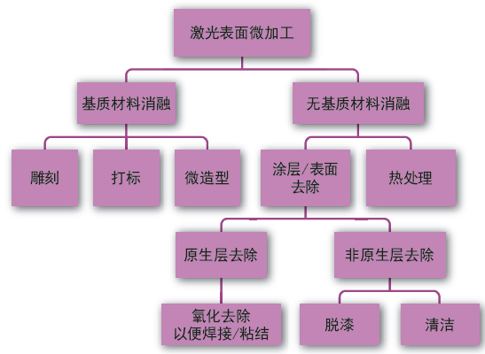 雖然這些技術(shù)通常被稱為激光微造型,從機(jī)械角度來看,這些工藝與激光打標(biāo)息息相關(guān),因?yàn)樗鼈兙窒抻趯?duì)部件的表面處理,通常需要結(jié)合采用激光消融與熔融工藝。圖1嘗試著用行業(yè)廣為接受的術(shù)語以及所涉及的主要物理機(jī)制,來對(duì)這種范圍廣泛的工藝進(jìn)行分類。