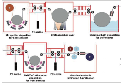 采用PI柔性襯底,可利用卷繞技術(shù)(Roll-to-Roll生產(chǎn)工藝),將材料折疊成卷,可大規(guī)模制造質(zhì)量輕、可彎曲的電池,相對于傳統(tǒng)的剛性襯底(玻璃等)薄膜電池,可大大提高生產(chǎn)效率,流水線生產(chǎn)過程如圖3所示: