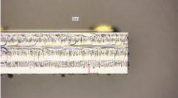 幾年前,德龍激光通過核心技術(shù)團(tuán)隊(duì)技術(shù)攻關(guān),成功研發(fā)出了激光應(yīng)力誘導(dǎo)切割技術(shù),并申請了專利,將該技術(shù)應(yīng)用于藍(lán)寶石、玻璃、硅、SiC等多種材料的切割。激光應(yīng)力誘導(dǎo)切割主要原理是將短脈沖激光光束透過材料表面聚焦在材料中間,在材料中間形成改質(zhì)層,然后通過外部施加壓力使芯片分開。中間形成的改質(zhì)層如圖1所示: