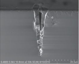 表面燒蝕切割是較為普遍的激光切割工藝,其原理是將激光聚焦于所需材料的表面,聚焦的地方吸收激光能量后形成去除性的融化和蒸發(fā),在切割表面形成一定深度的“V”型口,然后通過外部施加壓力使芯片分開,在半導(dǎo)體行業(yè)中由于其加工精度要求高,對表面效果要求也高,多采用短脈沖激光或超短脈沖激光。短脈沖激光器切割完后的“V”型槽效果如圖3所示: