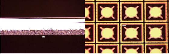 目前,該切割技術(shù)廣泛應(yīng)用于LED芯片、MEMS芯片、FRID芯片、SIM芯片、存儲(chǔ)芯片等諸多晶圓的切割,如圖2以硅襯底MEMS晶圓為例,可以看到應(yīng)力誘導(dǎo)切割的芯片幾乎沒有崩邊,芯片沒有機(jī)械損傷。